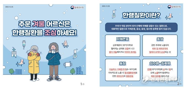 질병관리청 지영미 청장은 “한랭질환은 사전에 적절한 조치로 사고를 방지할 수 있으므로, 한파 대비 건강수칙을 준수해 줄 것”을 당부하며, 특히 “한파에 취약한 65세 이상 어르신과 노숙인, 독거노인 등 취약계층에 대해 각별한 관심이 필요”하다고 거듭 강조했다.