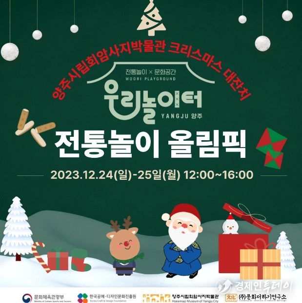 경제인투데이 유종운 기자 | 양주시는 오는 24일부터 25일까지 양일간 전통 놀이 문화공간 ‘우리놀이터 양주’에서 양주시립회암사지박물관과 ㈜문화더하기연구소가 함께 주관하는 ‘크리스마스 특별프로그램’을 진행한다고 밝혔다.
