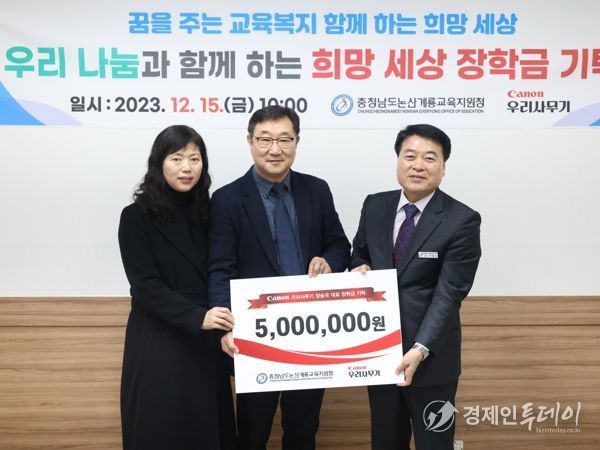 경제인투데이 유종운 기자 | 논산계룡교육지원청은 15일 롯데캐논우리사무기로부터 장학금 500만원을 기탁받았다.
