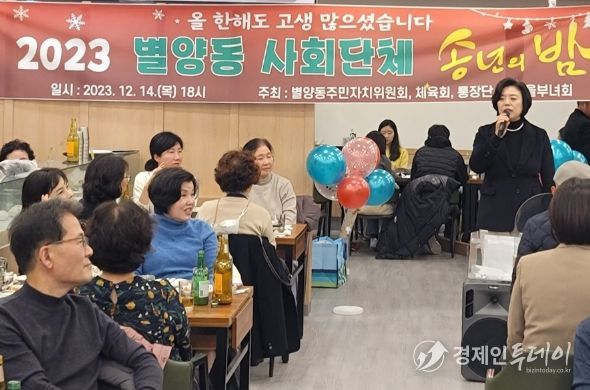 경제인투데이 유종운 기자 | 15일 과천시에 따르면, 별양동 주민자치위원회, 통장단, 체육회, 부녀회, 지역사회보장협의체 등 별양동 사회단체에서는 지난 14일 관내 한 음식점에서 회원 100여 명이 참석한 가운데 ‘별양동 송년의 밤’ 행사를 열었다.