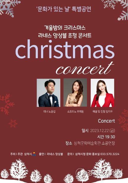 경제인투데이 유종운 기자 | 삼척시가 오는 12월 22일 오후 7시 30분 삼척문화예술회관 소공연장에서 문화가 있는 날을 맞이하여 크리스마스 콘서트를 개최한다.