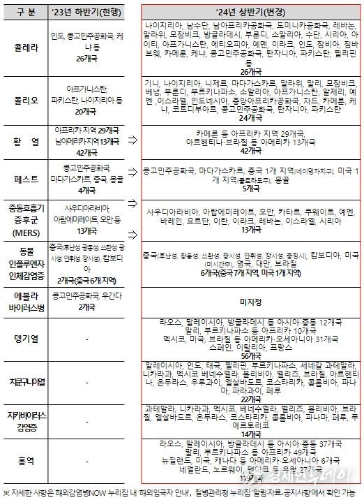 ’24년도 상반기 검역관리지역으로는 콜레라 26개국, 폴리오 24개국, 황열 42개국, 페스트 5개국, 중동호흡기증훈군 13개국, 동물인플루엔자 인체감염증 6개국, 뎅기열 56개국, 치쿤구니야열 22개국, 지카바이러스감염증 14개국, 홍역 119개국 등이 지정됐다. 이는 종전 ‘23년도 상반기 검역관리지역 74개국에서 82개국이 늘어난 총 156개국이 지정됐다. 다만, 코로나19의 경우 단계적 일상회복에 따라 지속 모니터링하기로 결정했다.