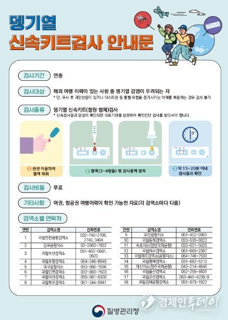 경제인투데이 류현민 기자 | 질병관리청은 국민의 건강과 자유로운 경제활동 및 소중한 일상을 지키기 위한 2024 민생정책으로 올해부터 전국 국립 검역소(13개)에서 국민들의 안전한 해외여행을 위해 연중 뎅기열 신속키트검사를 확대 실시한다. 이는 뎅기열이 검역감염병으로 추가 지정(’23.12.1.)됨에 따라 해외유입의 선제적 환자 감시를 위해 강화된 조치이다.