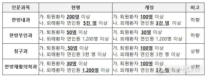 둘째, 한방의료 이용 환자 주요 질환이 내과계에서 근골격계로 변화하는 등의 현실을 반영하여 한방내과 및 한방부인과의 연간 환자 진료실적 기준을 하향하고, 침구과 및 한방재활의학과는 기준을 상향 조정했다.