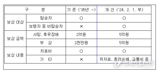 이에 국방부 및 보험사는 군 차량 사고시 보험 보상의 완전성을 갖추기 위해 보상의 대상을 보행자 등 비탑승자까지 확대하고, 최대 보상 금액도 민간과 동일한 수준으로 맞춰 군인·군무원·경찰 피해시 사망, 후유장애, 부상 모두 각각 5억원까지 보상받도록 했다. 특히 그동안 치료비로 한정됐던 보상을 위자료, 휴업손해, 교통비 등도 추가 지급할 수 있어 피해자에 대한 보상이 보다 현실화 됐다.