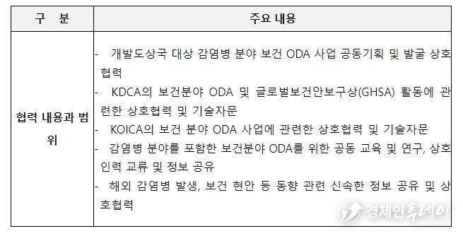 이번 양해각서의 개정을 통해 양 기관은 ▲개발도상국 대상 보건 공적개발원조 사업에 대한 공동 기획 및 상호 협력을 시행하고, 특히, ▲팬데믹 대비 해외 감염병 발생, 보건 현안 등 동향 관련하여 신속한 정보를 공유하는 데까지 협력 범위를 넓혀 나가기로 했다.