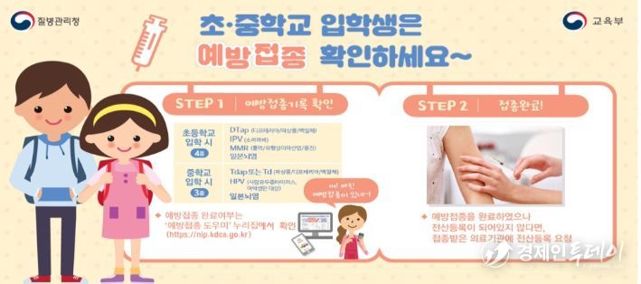 경제인투데이 류현민 기자 | 질병관리청과 교육부는 학생들의 감염병 예방과 건강 보호를 위해 초·중학교 입학 전 필수예방접종(초등학교 4종, 중학교 3종)을 완료할 것을 권고했다.