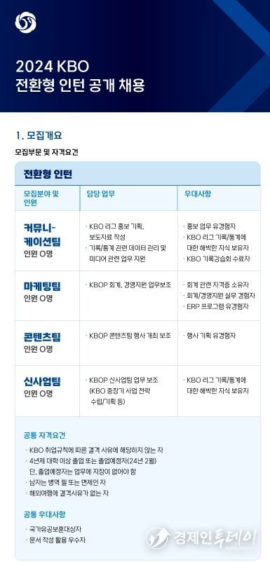 경제인투데이 류현민 기자 | KBO(총재 허구연)가 오늘 13일(화)부터 전환형 인턴 사원을 채용한다.