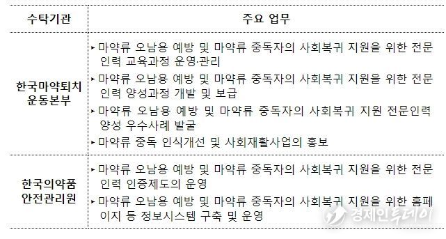 제정안에 따르면 ‘전문인력 교육과정 운영·관리’ 업무는 한국마약퇴치운동본부가 맡고, ‘인증제의 전반적인 운영·관리’ 업무는 한국의약품안전관리원이 식약처로부터 위탁받아 운영하게 된다.