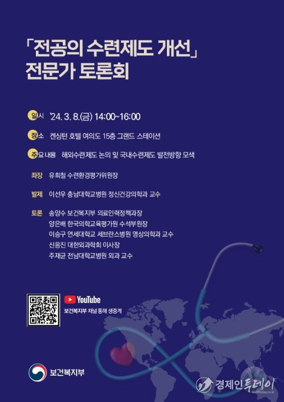 경제인투데이 류현민 기자 | 보건복지부는 3월 8일 오후 2시 여의도 캔싱턴호텔에서 전공의 수련제도의 개선방향 논의를 위한'전공의 수련제도 개선 전문가 토론회'를 개최했다.