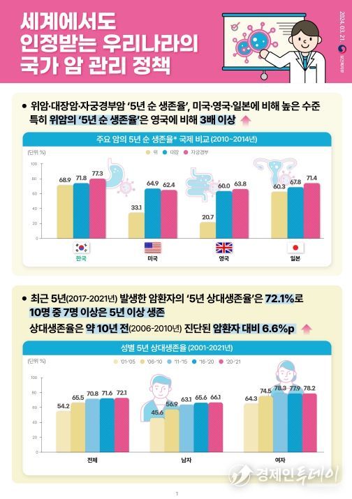 우리나라 암 환자의 5년 상대생존율은 2000년 45.2%에서 2021년 72.1%로 크게 향상되었으며, 세계 최고 수준이다.