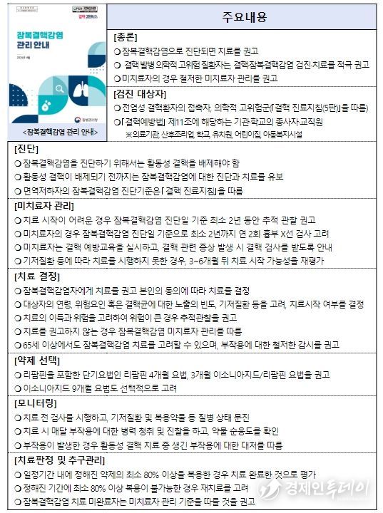 경제인투데이 류현민 기자 | 질병관리청은 국내 상황에 맞게 잠복결핵감염 검진과 치료관리를 제시하는 「잠복결핵감염 관리 안내」를 발간하였다.