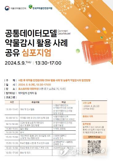 경제인투데이 류현민 기자 | 식품의약품안전처는 한국의약품안전관리원과 함께 의약품 안전정보 분석‧평가 등에 실사용 데이터(RWD) 이용을 활성화하기 위한 ‘공통데이터모델(CDM) 약물감시 활용 사례 공유 심포지엄’을 포스트타워 대회의실(서울 중구)에서 5월 9일 개최한다고 밝혔다.