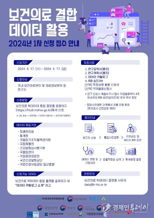 경제인투데이 류현민 기자 | 보건복지부는 인공지능(AI) 신약 개발 등 디지털 헬스케어 연구 활성화를 위해 보건의료 빅데이터 플랫폼*을 통해 2024년 1차 보건의료 결합데이터 활용신청을 4월 17일부터 5월 17일까지 접수한다고 밝혔다.
