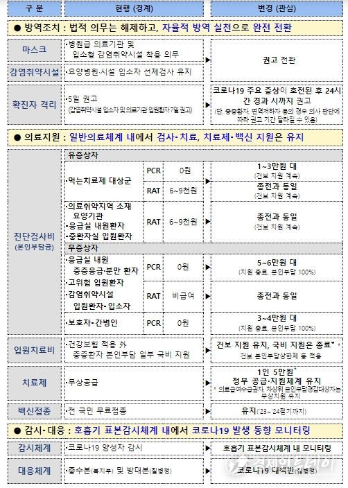 코로나19 검사비의 경우, 우선 무증상 선별검사가 필요 없는 방역 상황을 고려하여 무증상자에 대한 검사비 지원은 없어진다. 유증상자 중 60세 이상 어르신과 같은 먹는치료제 대상군과 의료취약지역소재 요양기관, 응급실 내원환자, 중환자실 입원환자에 대해서는 신속한 검사를 위해 신속항원검사(RAT)를 종전처럼 지원한다(6~9천 원대 수준).