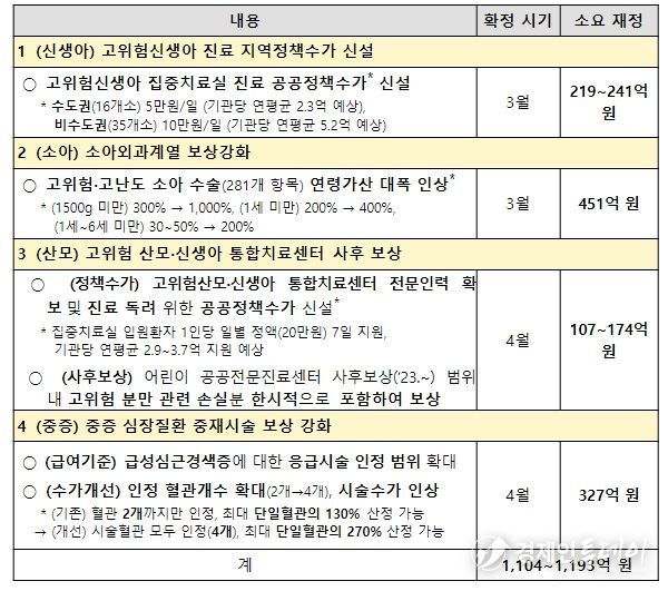 한편, 정부는 지난 3월 26일 중대본에서 중증심장질환 중재시술을 포함하여 ▴신생아 ▴소아 ▴산모 ▴중증질환 4개 분야에 올해 약 1,200억 원 건강보험 재정을 투입하기로 결정한 바 있으며, 차질없이 이행 중이다.