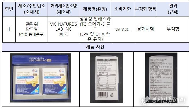 또한, 국내 유통 중인 건강기능식품 183건을 수거·검사한 결과, 182건은 기준·규격에 적합했고 오메가-3 제품 1건(미국산, EPA 및 DHA 함유 유지)이 붕해시험 부적합 판정되어 회수·폐기 등을 요청했다.