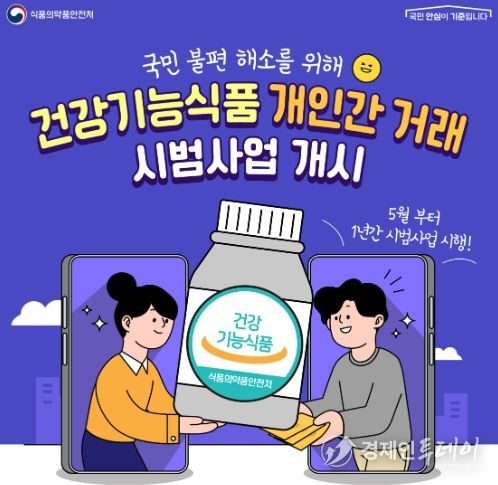 경제인투데이 류현민 기자 | 식품의약품안전처는 건강기능식품의 소규모 개인 간 거래에 대한 합리적 개선방안 마련을 위해 오는 5월 8일부터 1년간 ‘건강기능식품 개인간 거래 시범사업’을 시작한다고 밝혔다.