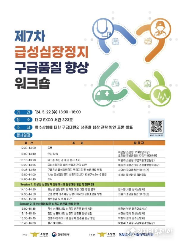 경제인투데이 류현민 기자 | 질병관리청과 소방청은 5월 22일 13시부터 16시까지 대구 EXCO(대구광역시 북구 소재)에서 '제7차 급성심장정지 구급품질 향상 워크숍'을 개최한다고 밝혔다.