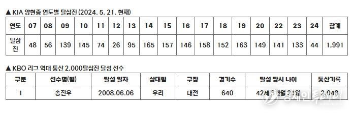 한편 양현종은 KBO 리그 개인 최다 탈삼진 기록에도 근접했다. 현재 기록을 보유하고 있는 송진우의2,048개에도 57개 차로 근접해 이번 시즌 대기록 경신이 가능하다. 또한 2014 시즌부터 2023시즌까지 9시즌 연속 세자릿 수 탈삼진을 기록한 양현종은 탈삼진 56개를 추가하면 전 해태 이강철, 전 두산 장원준과 함께 10시즌 연속 세자릿 수 탈삼진으로 이 부문 연속 기록 최다 타이를 이루게 된다.