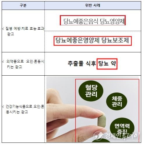 경제인투데이 류현민 기자 | 식품의약품안전처는 온라인 쇼핑몰 등에서 일반 식품을 ‘당뇨영양제’, ‘당뇨개선제’, ‘당뇨약’ 등으로 광고하며 판매하는 온라인 게시물 200건을 집중 점검한 결과, 「식품 등의 표시‧광고에 관한 법률」을 위반한 177건을 적발해 방송통신심의위원회 등에 접속 차단을 요청하고, 관할 지방자치단체에 행정처분을 요청했다고 밝혔다.