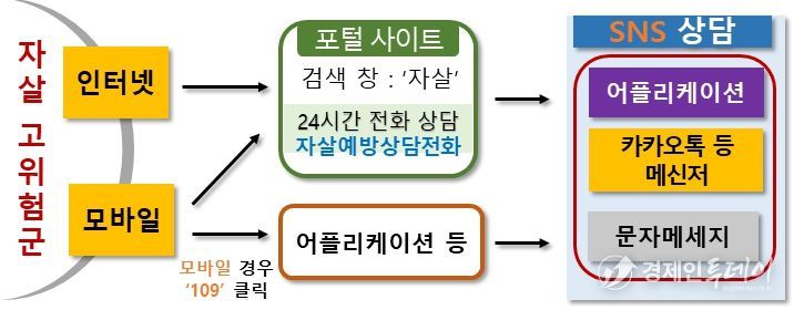 자살예방 SNS 상담은 텍스트 대화에 익숙한 청소년·청년층의 접근성을 고려하여 상담 창구를 다양화하기 위해 어플리케이션, 메신저, 문자메세지 등을 활용하는 상담 체계로서 올해 9월부터 운영될 예정이다.