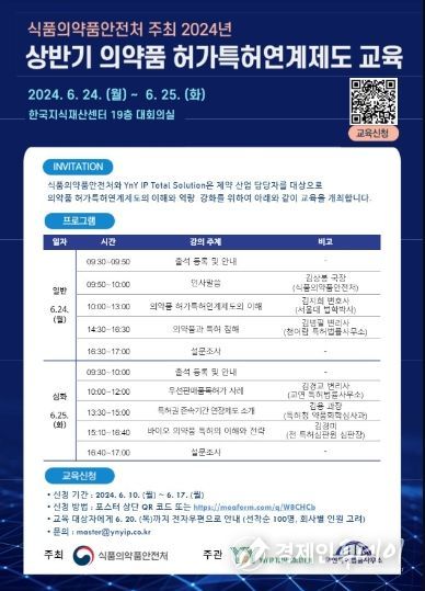 경제인투데이 류현민 기자 | 식품의약품안전처는 제약기업 등 관련 업계 담당자들을 대상으로 ‘2024년 상반기 의약품 허가특허연계제도 교육’(6.24.~25.)을 한국지식재산센터 대회의실(서울시 강남구 소재)에서 진행한다고 밝혔다.