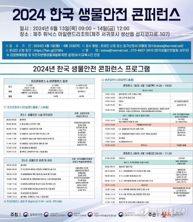 경제인투데이 류현민 기자 | 질병관리청은 안전한 질병연구와 산업발전을 위한 생물안전 관리 방안을 논의하기 위해 6월 13일부터 6월 14일까지 제주 휘닉스 아일랜드에서 '2024년 한국 생물안전 콘퍼런스'를 개최한다.