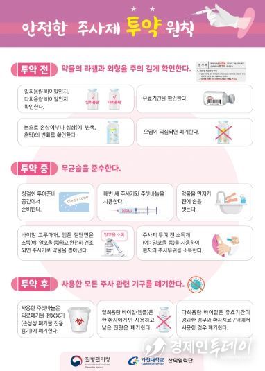 경제인투데이 류현민 기자 | 질병관리청은 주사제·약물 투약 과정에서 감염 발생을 최소화하고, 감염으로부터 안전한 투약 환경을 조성하고자 '투약 준비 관련 감염관리 권고안'을 발간한다고 밝혔다.
