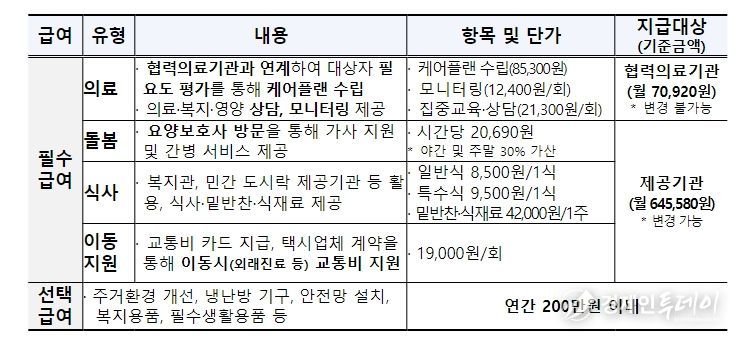 지원 대상자는 장기입원(1개월 이상) 중이지만 의료적 필요가 낮아 퇴원 가능한 의료급여 수급자로, 필요도 조사를 통해 돌봄계획을 수립한 다음, 해당 계획에 따라 의료·돌봄·식사·이동 지원의 필수 서비스와 주거 환경 개선·복지용품 및 냉난방 용품 제공 등의 선택 서비스를 제공받을 수 있다.