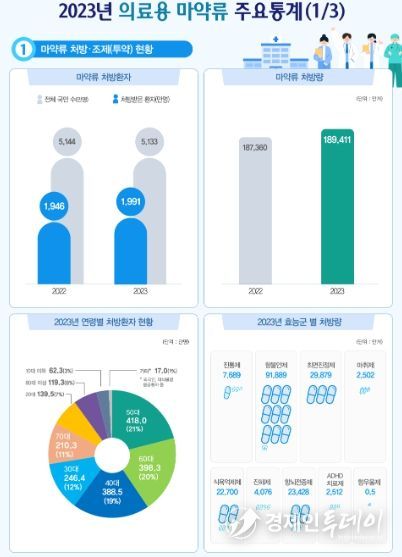 지난해 의료용 마약류를 처방받은 환자는 1,991만 명, 처방량은 18억 9,411만 개로 집계되어, 전체 환자 수는 전년 대비 45만 명이 증가했으며, 처방량도 2천 51만 개가 늘어났으나 1인당 처방량은 약간 감소했다.