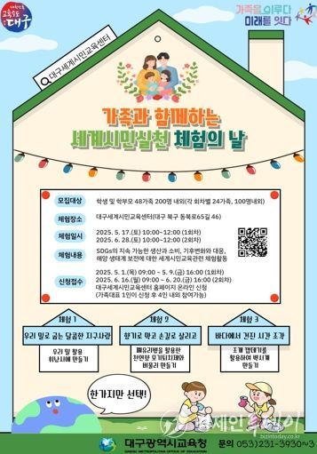 경제인투데이 류현민 기자 | 대구시교육청은 오는 5월 17일과 6월 28일에 대구세계시민교육센터에서 각 회차별 24가족을 대상으로‘가족과 함께하는 세계시민실천 체험의 날’행사를 운영한다.