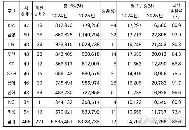 이로써 오늘 경기까지 누적 관중 802만 8,733명을 기록하며 역대 최소 경기인 465경기만에 800만 관중을 돌파했다. KBO 리그 전체 좌석 점유율은 83.6%를 기록 중이다.