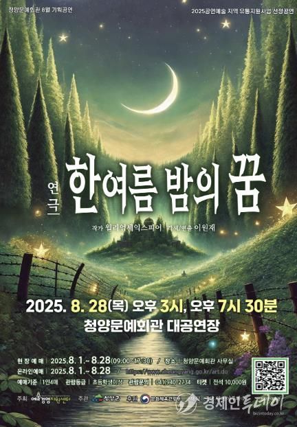 경제인투데이 류현민 기자 | 청양군이 오는 28일 오후 3시와 7시 30분 2회에 걸쳐 청양문예회관 대공연장에서 연극 ‘한여름 밤의 꿈’을 선보인다.