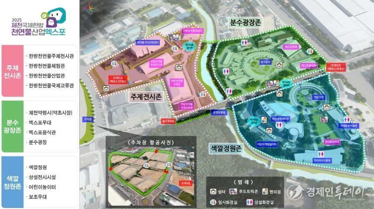 ‘분수광장존’은 전통 약초시장을 재현한 제천약령시, 정상급 공연과 박달가요제, 청풍동요제, 한가위 콘서트, 마당극 등이 열리는 엑스포무대와 음식관으로 구성되며, ‘색깔정원존’은 색깔정원, 상설전시시설, 어린이놀이터 등 가족 친화형 휴식 공간을 갖춘다.