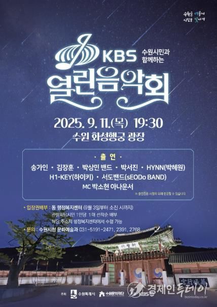 경제인투데이 류현민 기자 | ‘수원시민과 함께하는 KBS 열린음악회’가 9월 11일 오후 7시 30분 수원화성행궁 광장에서 열린다.