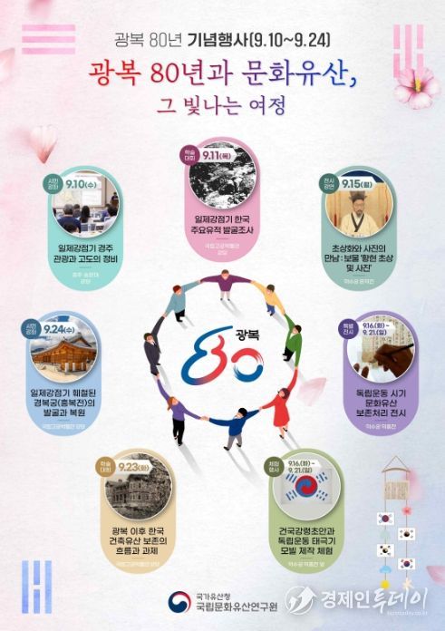 경제인투데이 류현민 기자 | 국가유산청 국립문화유산연구원은 국민과 함께 광복 80주년의 의미를 되새기기 위해 ‘광복 80년과 문화유산, 그 빛나는 여정’을 주제로, 9월 10일부터 2주간 고고·건축·미술·보존과학 분야에서 학술대회, 전시 및 체험, 시민강좌 등 다채로운 행사 7건을 개최한다.