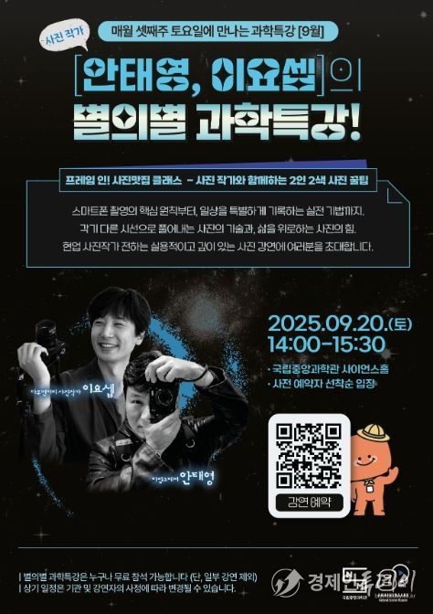 과학기술정보통신부 국립중앙과학관은 매월 셋째 주 토요일에 개최하는 ‘별의별 과학특강’의 9월 강연에 사진 분야에서는 개성 있는 작품 세계로 잘 알려진 두 명의 전문작가 안태영과 이요셉을 초청해 강연을 개최한다고 밝혔다. 안태영 작가는 일상의 순간을 특별하게 담아내는 ‘타임그래퍼’로, 스마트폰을 활용해 평범한 풍경을 낭만적인 장면으로 기록하는 작업으로 주목 받고 있다. 이요셉 작가는 다큐멘터리 사진 작가로 사진과 영상, 글과 그림을 결합한 스토리텔링 작업으로 잘 알려져 있으며 NGO와의 협업, 구호 활동 참여 등 사회적 메시지를 담은 작품 활동도 활발하다.