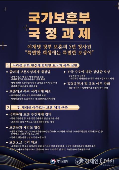 경제인투데이 류현민 기자 | 국가보훈부는 16일 새정부 국정과제로 '나라를 위한 헌신에 합당한 보상과 예우 실현', '전 세대를 아우르는 보훈 체계 구축'이 확정됐다고 밝혔다.