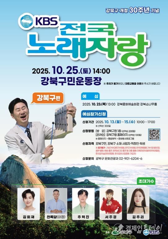 경제인투데이 류현민 기자 | 강북구는 개청 30주년을 기념해 오는 10월 25일 오후 2시 강북구민운동장에서 KBS 장수 예능 프로그램 ‘전국노래자랑’ 강북구편을 개최한다고 밝혔다.