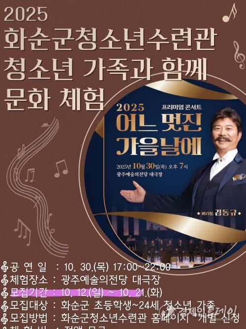 경제인투데이 류현민 기자 | 화순군은 2일 청소년수련관에서 짙어가는 가을의 정취 속에 청소년과 가족이 함께하는 특별한 문화체험, 바리톤 김동규의 프리미엄 콘서트'어느 멋진 가을날'을 관람할 청소년 가족 60명을 선착순 모집한다고 밝혔다.