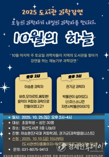 경제인투데이 류현민 기자 | 고양특례시 일산도서관에서는 과학자들의 재능기부 도서관 과학 강연프로그램 ‘10월의 하늘’을 운영한다.