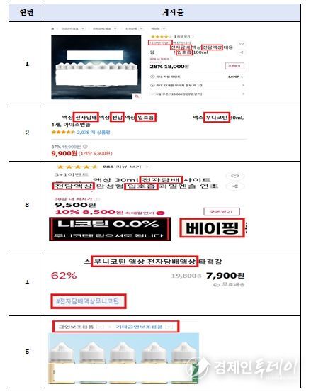 경제인투데이 류현민 기자 | 식품의약품안전처는 시중에서 판매되는 ‘무니코틴 표방 액상 흡입제품’에 대해 ‘의약외품(니코틴이 포함되지 않은 흡연욕구저하제, 흡연습관개선보조제)’ 오인 우려 광고로 보아 지난 9월 집중 점검을 실시했다.