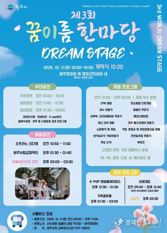 이번 행사에서는 ‘K-POP 데몬헌터스 주제가’ 등 인기곡에 맞춰 자유롭게 댄스 실력을 뽐내는 랜덤플레이댄스를 비롯해 소프라노 신다영, 원주시립교향악단, 버블아티스트 이한의 초청 공연 무대가 준비됐다.