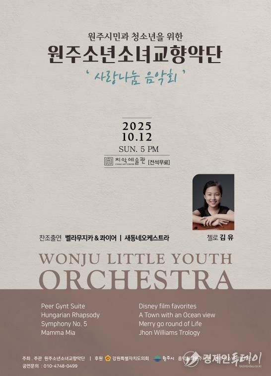 경제인투데이 류현민 기자 | 원주소년소녀교향악단은 오는 12일 오후 5시, 치악예술관에서 ‘사랑나눔음악회’를 통해 지역사회와 함께하는 따뜻한 무대를 마련한다.