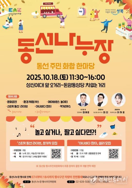 행사에 앞서 9월 30일까지 아나바다 장터 참가자와 주민 장기자랑 무대 참여자를 모집하고 있다. 누구나 신청 가능하며, 신청 방법은 동선나누장 행사추진위원회 또는 동선동 주민센터 누리집에서 확인할 수 있다. 주최 측은 “많은 주민의 자발적인 참여가 행사의 의미를 더욱 풍성하게 만들 것”이라며 적극적인 관심과 신청을 당부했다.