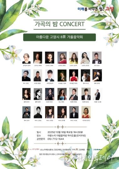 경제인투데이 류현민 기자 | 고양특례시가 후원하고, (사)한국예술문화단체총연합회 고양지회가 주최하며 (사)한국음악협회 고양지부가 주관하는 ‘2025 가곡의 밤 – 아름다운 고양시 8경(景) 가을 음악회’가 오는 16일 오후 7시 30분, 고양아람누리 아람음악당에서 개최된다.