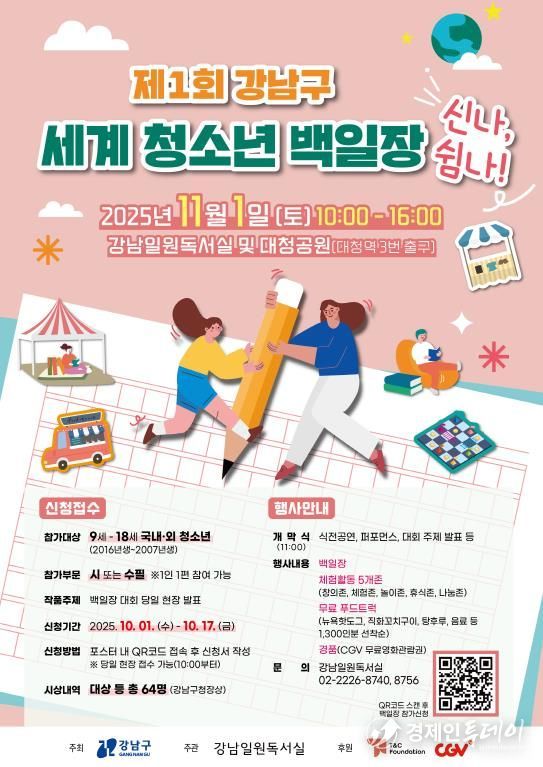 경제인투데이 류현민 기자 | 꿈이 모이는 도시, 미래를 그리는 강남구가 오는 11월 1일 오전 10시부터 오후 4시까지 강남일원독서실과 대청공원 일대에서 ‘제1회 강남구 세계청소년백일장 신나, 쉼나!’를 개최한다. 이 행사는 국내‧외 국적 청소년이 함께하는 전국 최초의 기초지자체 주관 백일장으로, 다문화 시대와 K-컬처 확산 흐름에 발맞춘 문학축제다.