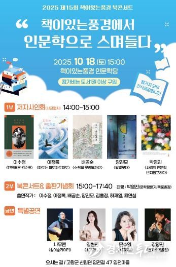 올해로 15번째를 맞는 이번 북콘서트는 저자사인회, 북토크, 출판기념회가 함께 진행돼 작가와 독자가 직접 마주 앉아 이야기를 나누는 교류의 장으로 행사에는 제4회 고창신재효문학상 수상자인 이수정 작가(『단역배우 김순효』), 이정록 작가(『파도는 파도파도파도』), 배공순 작가(『우리, 수작할까요』), 양진모 작가(『달빛무대』) 등 문학계에서 활발히 활동 중인 작가들이 함께한다. 이들은 각자의 작품 세계를 소개하고 창작의 여정을 들려주며, 독자들과의 질의응답을 통해 문학의 의미를 공유할 예정이다.