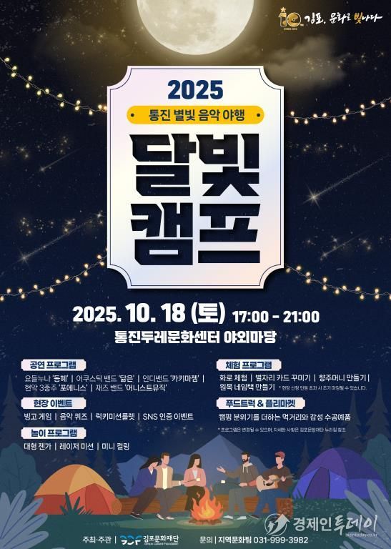 경제인투데이 류현민 기자 | (재)김포문화재단이 주관하는 2025 통진별빛음악야행 '달빛캠프'가 10월 18일 17시부터 통진두레문화센터 야외마당에서 개최된다.